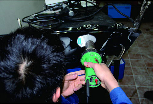 在鋁質(zhì)面板修復(fù)時(shí),也可使用鋁整形機(jī)對損傷部位進(jìn)行拉伸修復(fù),在經(jīng)整形機(jī)修復(fù)到位后,使用專用工具將螺紋介子齊根剪下,再打磨平整即可。對于鋼板車身來說,當(dāng)面板和內(nèi)層結(jié)構(gòu)同時(shí)發(fā)生變形時(shí),可以采取內(nèi)外層分離、分別修整,然后折邊咬合的修復(fù)方法。對于鋁質(zhì)面板,不能使用這種方法,否則由于鋁的韌度較差,折邊部位會(huì)出現(xiàn)裂紋或斷裂。