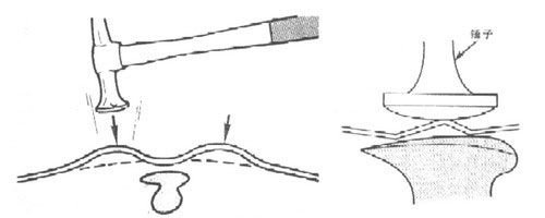 (1)為了降低拱起部位的高度,如果采用正托敲擊法,操作時(shí)應(yīng)多次輕敲,不能重敲,否則錘擊太重或次數(shù)過多會(huì)使鋁板延展拉伸,如圖1-89所示是正托敲擊法示意圖。
