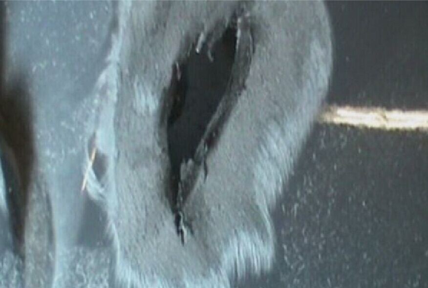 步驟7:對熔植的無銹加固網(wǎng)周圍進(jìn)行簡單的打磨,以增強(qiáng)其表面的附著力,便于后續(xù)進(jìn)行玻纖膠條覆蓋的操作,如圖1-7所示。